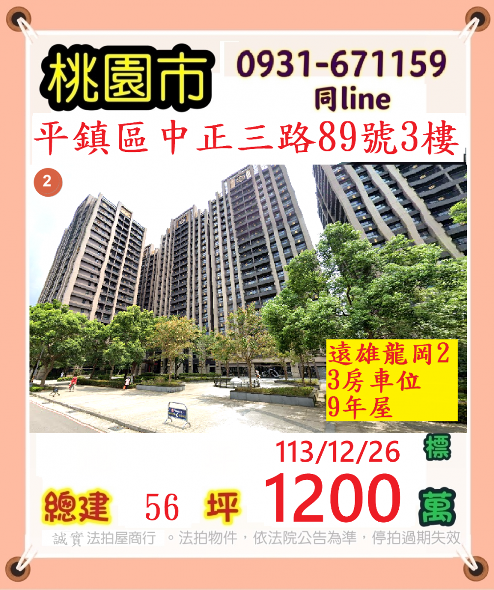 張經理推薦/桃園平鎮區中正三路(三房加車位九年屋遠雄龍岡2)