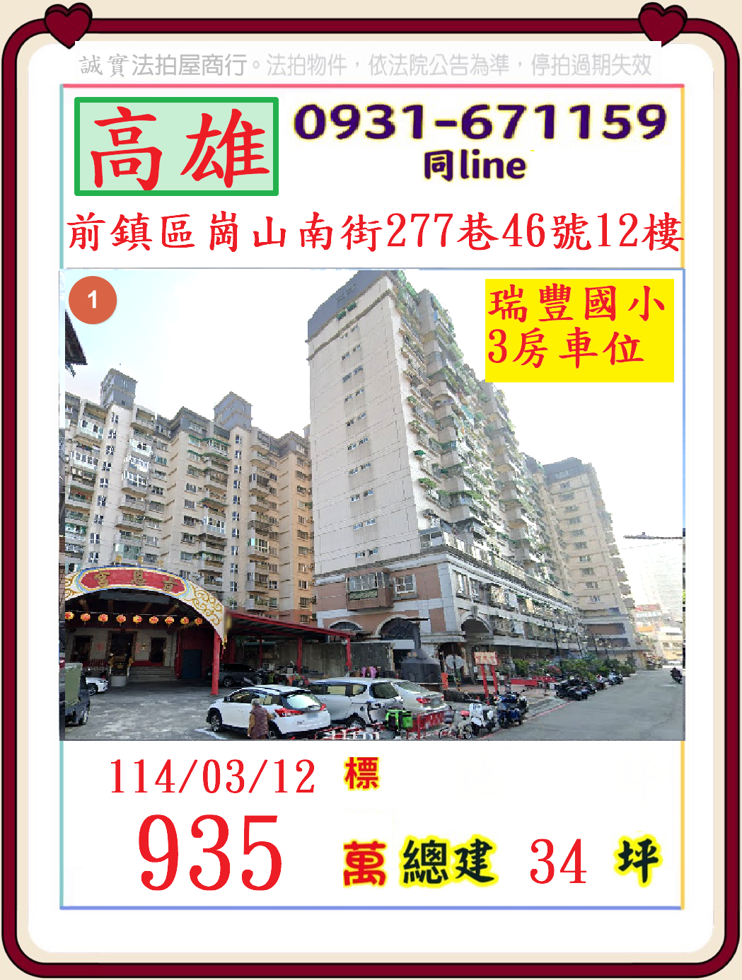 張經理推薦/高雄市前鎮區崗山南街(瑞豐國小3房電梯+車位)