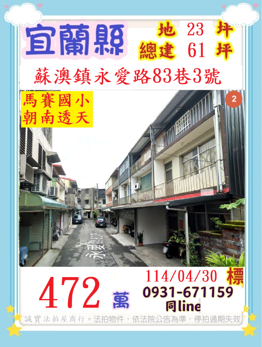張經理推薦/宜蘭市蘇澳鎮永愛路(馬賽國小朝南靜巷透天)