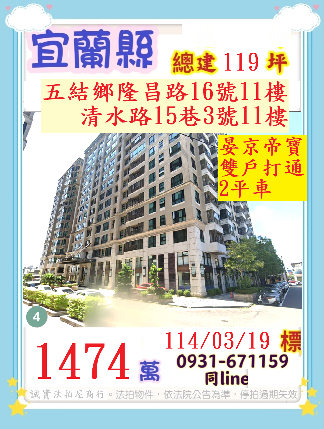 張經理推薦/宜蘭縣五結鄉(隆昌路.清水路晏京帝寶二戶二平車)