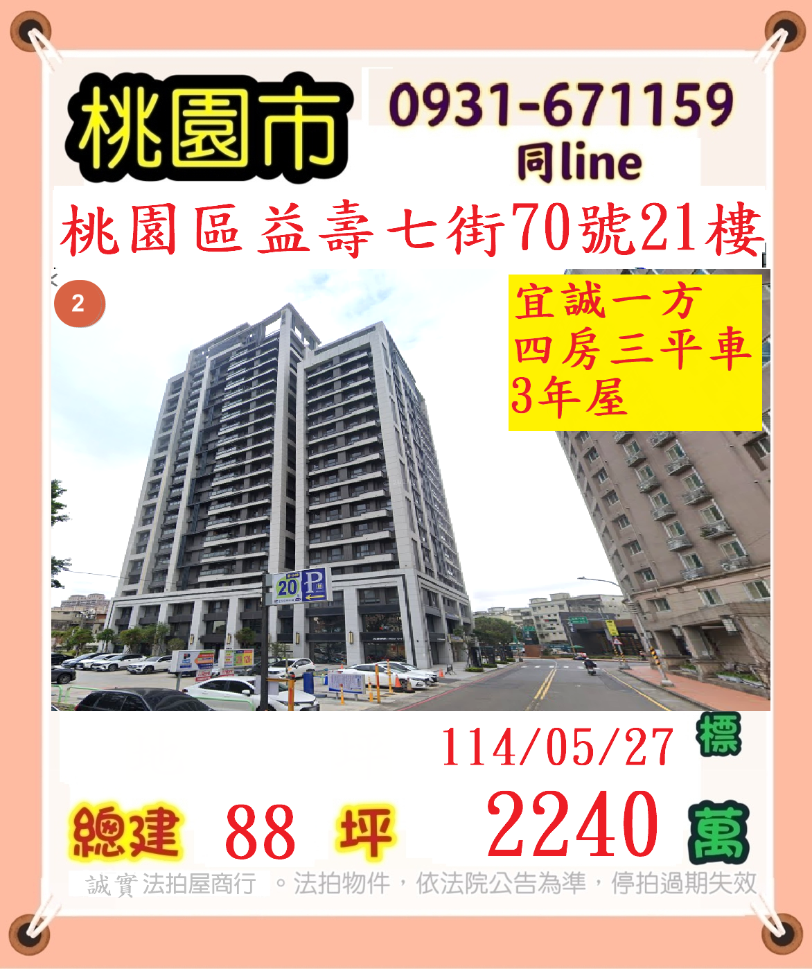 張經理推薦/桃園市桃園區益壽七街(宜誠一方四房三房車3年屋)