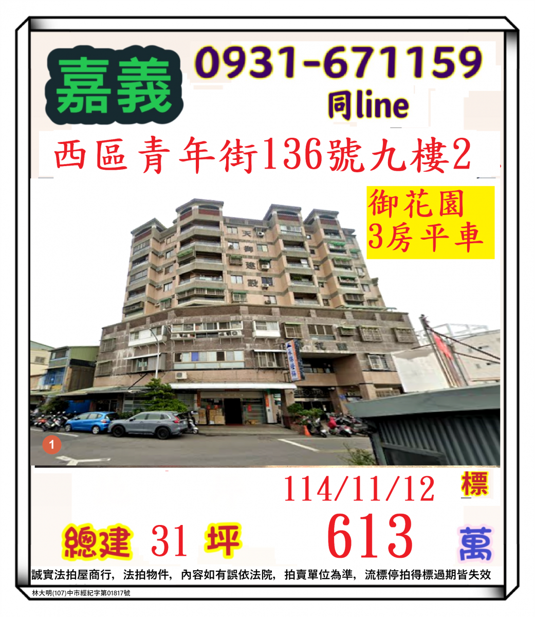 張經理推薦/嘉義市西區青年街(御花園3房平車視野戶)