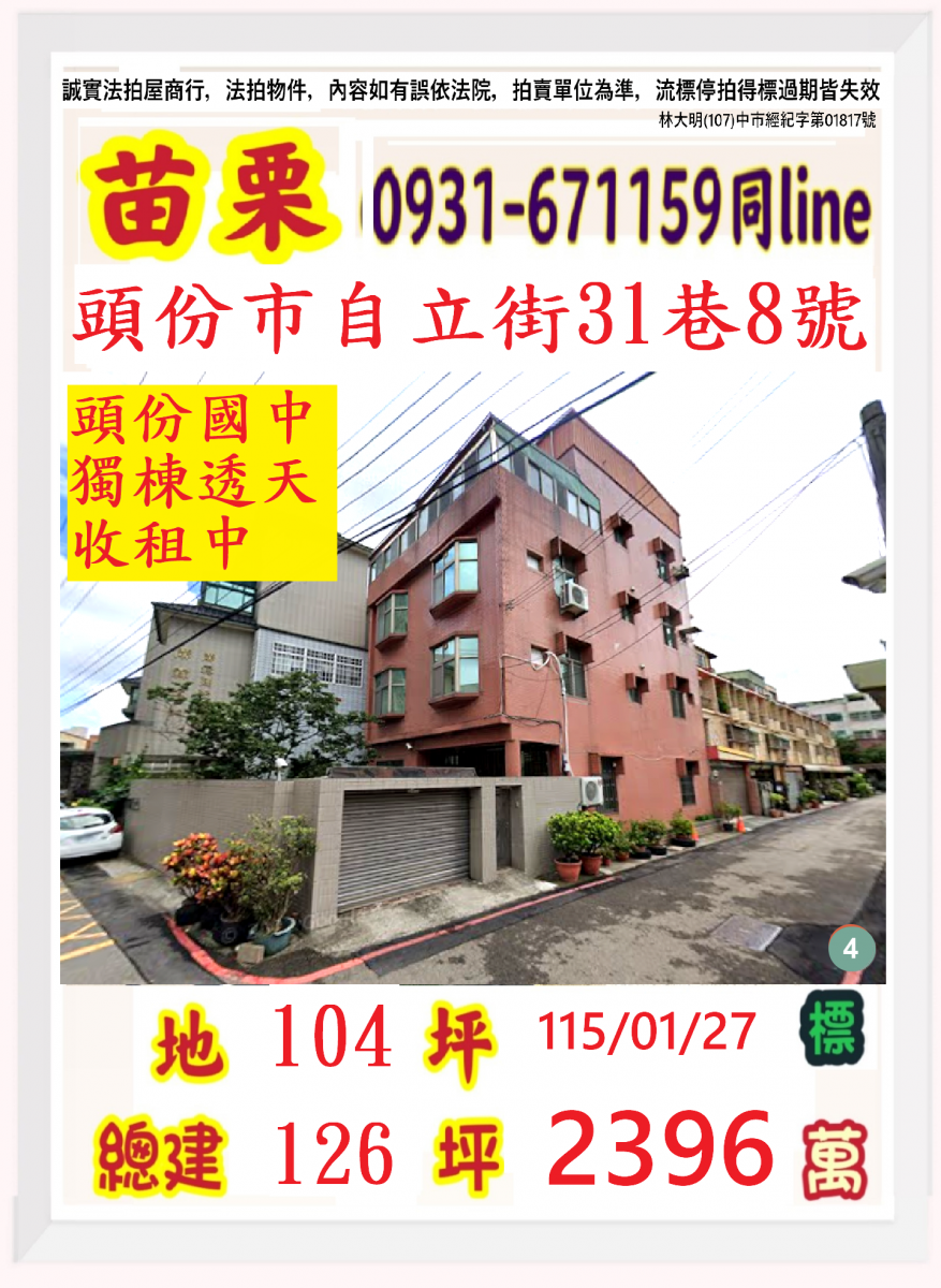 張經理推薦/苗栗縣頭份鎮自立街(頭份國中獨棟收租大透天)