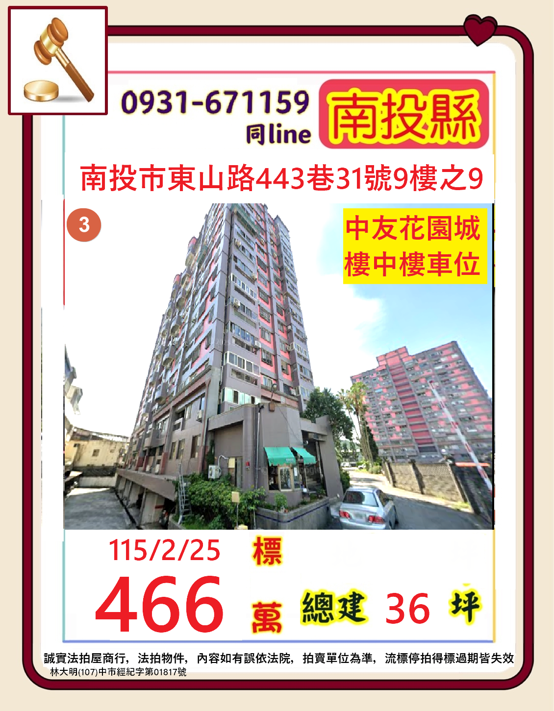 店長推薦~南投市東山路~中友花園城樓中樓+車位