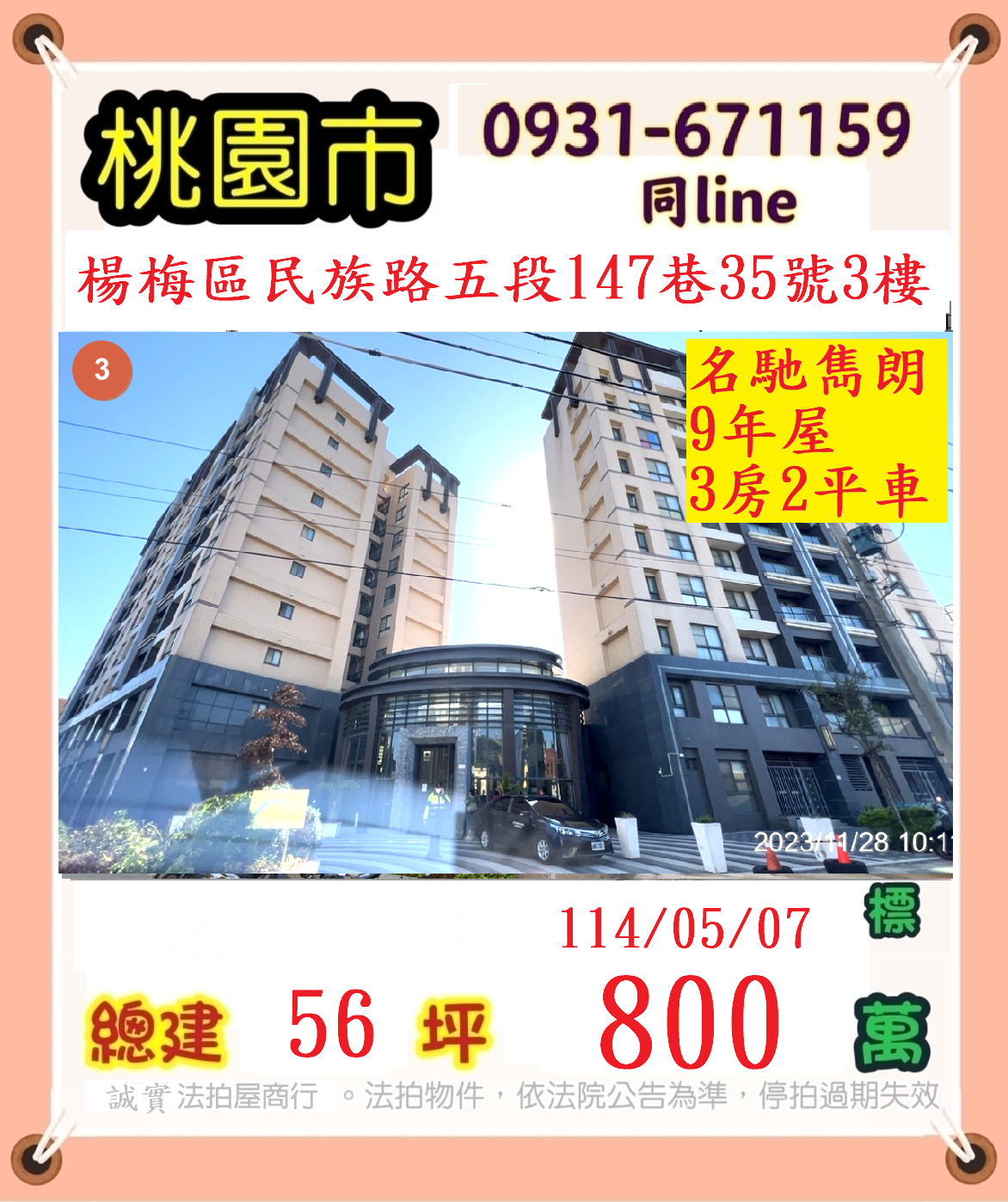張經理推薦/桃園楊梅區民族路五段(名馳雋朗三房平車)