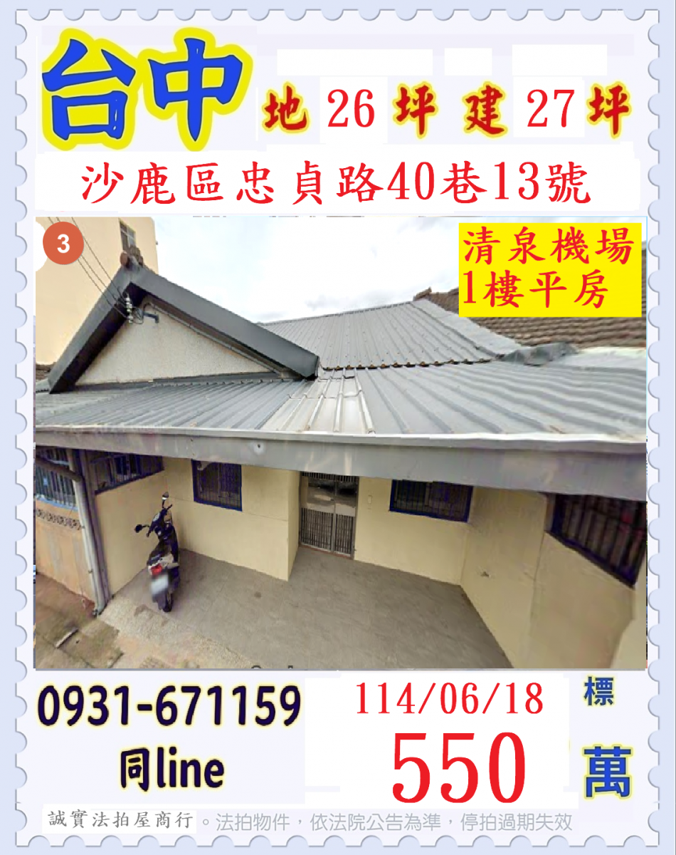張經理推薦/台中市沙鹿區忠貞路(清泉機場一樓平房)