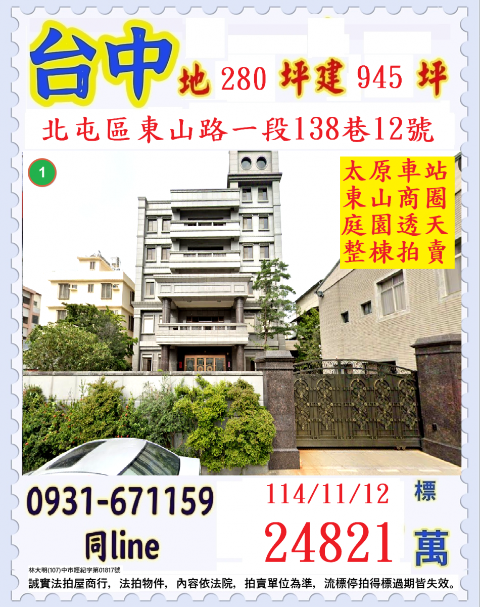 張經理推薦/台中市北屯區東山路一段(太原火車庭園七樓透天整棟)